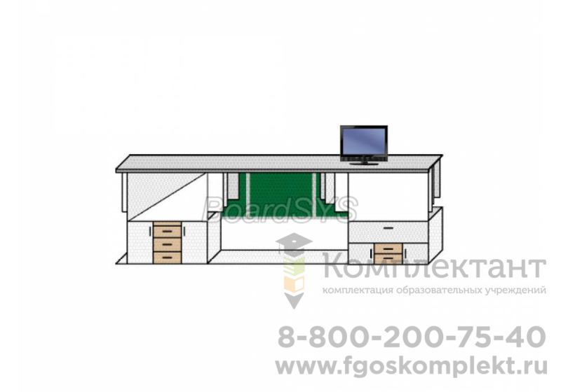 Комплектация изделия: Картотека 6-30 (система для хранения и демонстрации плакатного материала до 60 мм); Доска 100х140 текстильная (для проецирования изображений) илимагнитно-маркерная доска; Фальшпанель с выкатным ящиком (для дидактических материалов); Комплект аксессуаров; Профиль ПВХ для крепления плакатов 84 м.п.; Крючок-ролик 120 шт. «КАРТОТЕКА 1» используется для хранения и демонстрации плакатных материалов высотой не более 1,5 метров.